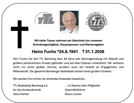 letzten Samstag ist unser Hauptsponsor, Herr Heinz Fuchs, im Alter von 84 Jahren plötzlich verstorben. Die Beisetzung findet auf Wunsch des Verstorbenen im engsten Familienkreis