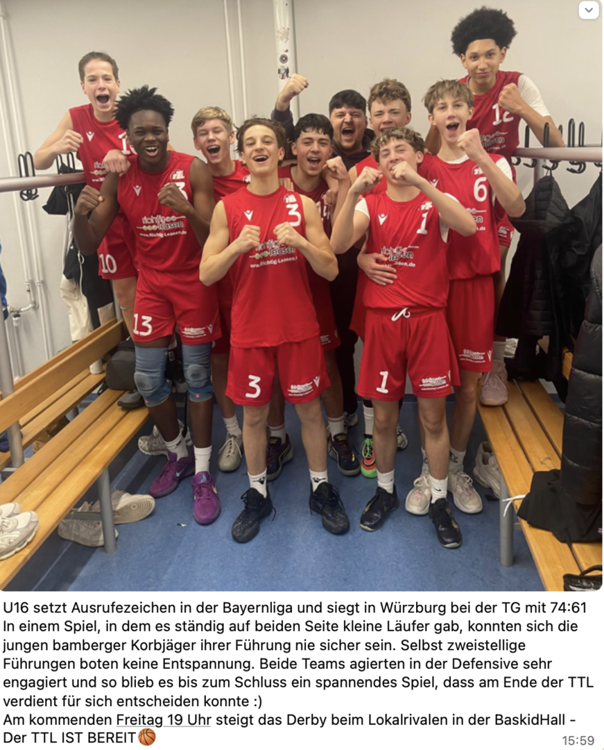Die U18 des TTL Bamberg feierte in der Landesliga einen überzeugenden 119:90-Heimsieg gegen die Frankonia Baskets Nürnberg und dominierte