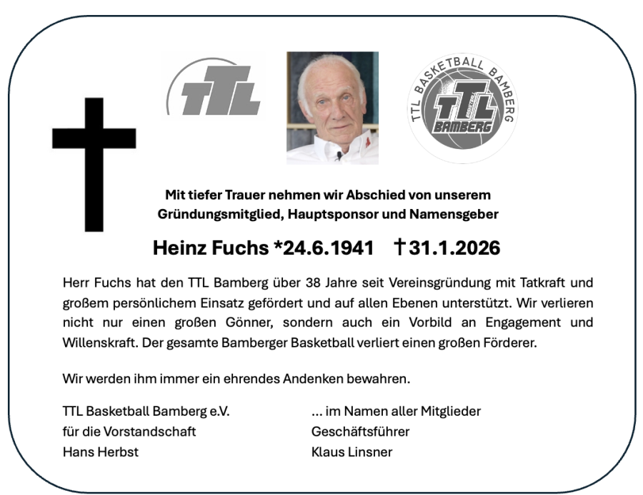 Basketball Bamberg wird zu seinem Gedenken vor dem nächsten Heimspiel der 1. Herren- mannschaft, am kommenden Samstag, gg. 17.50 Uhr, eine kurze Gedenkfeier abhalten. Es wäre schön, wenn sich